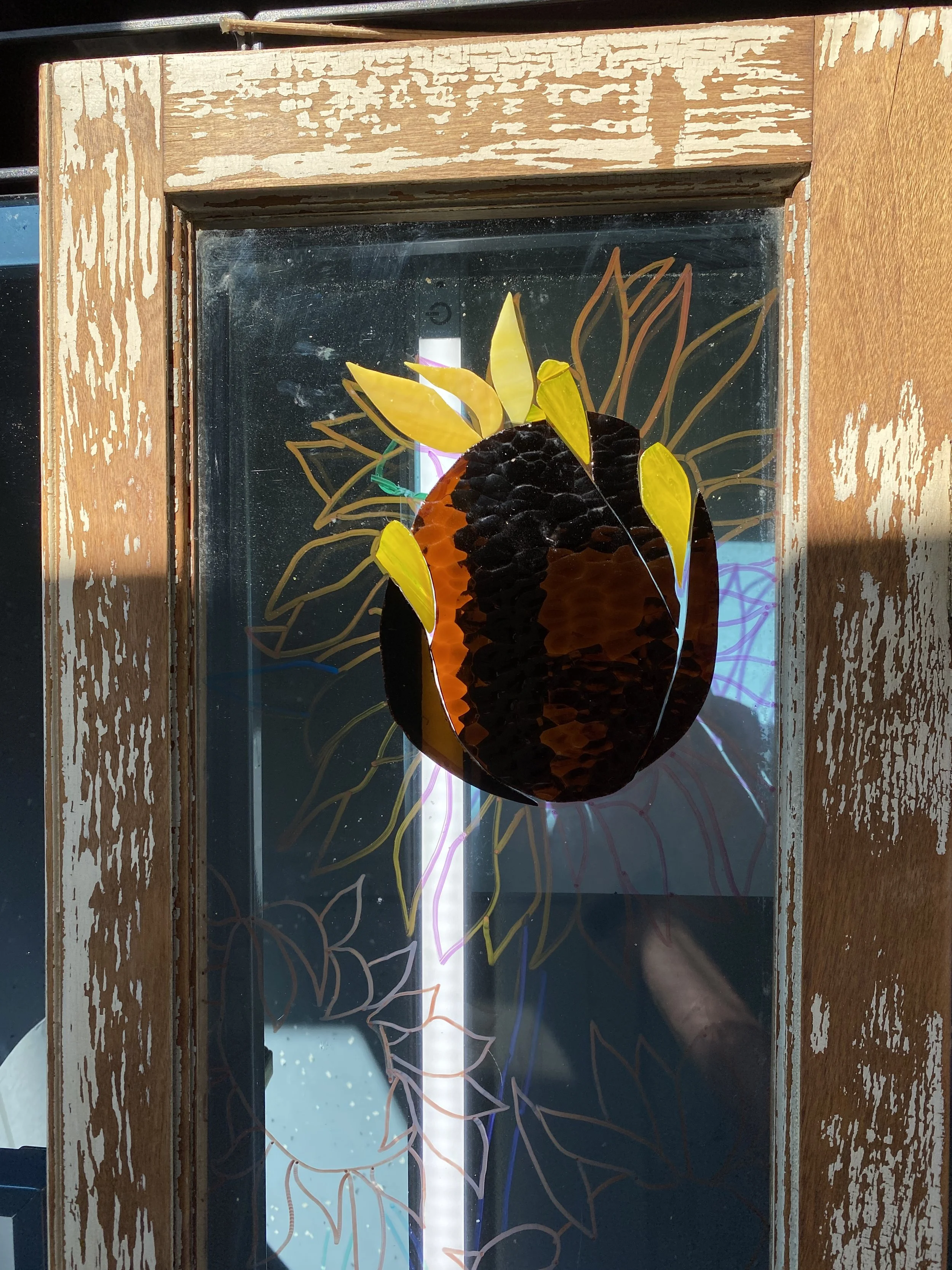 13.5” x 58.5”; Stained glass, adhesive and grout on a paned antique pantry door