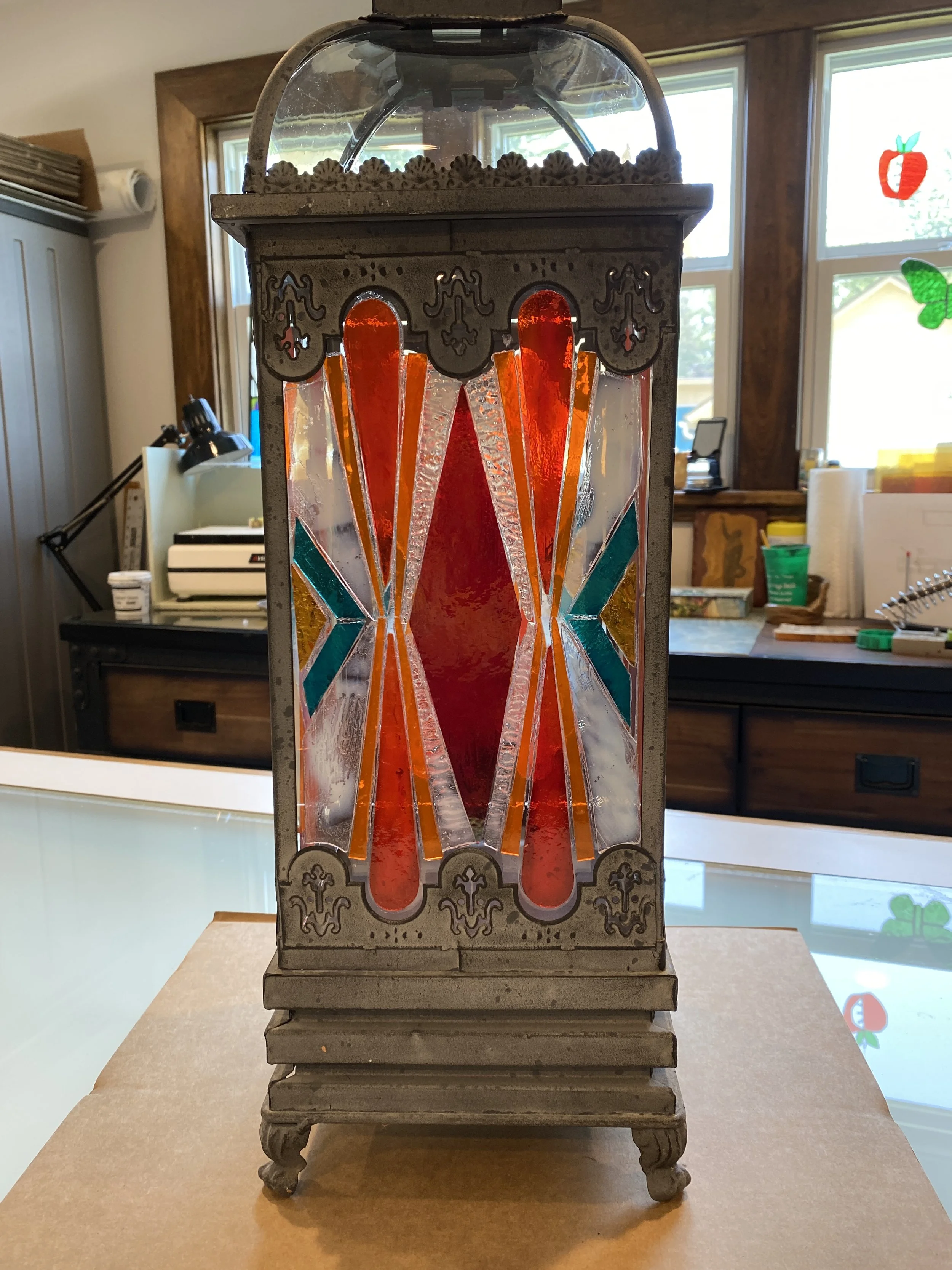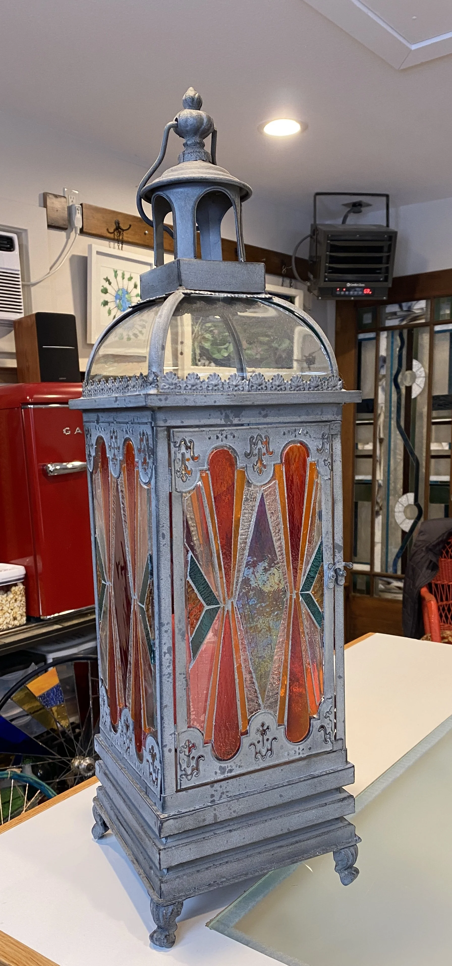29” x 8” x 8” ; Stained glass, adhesive and grout on a glass paned metal lantern