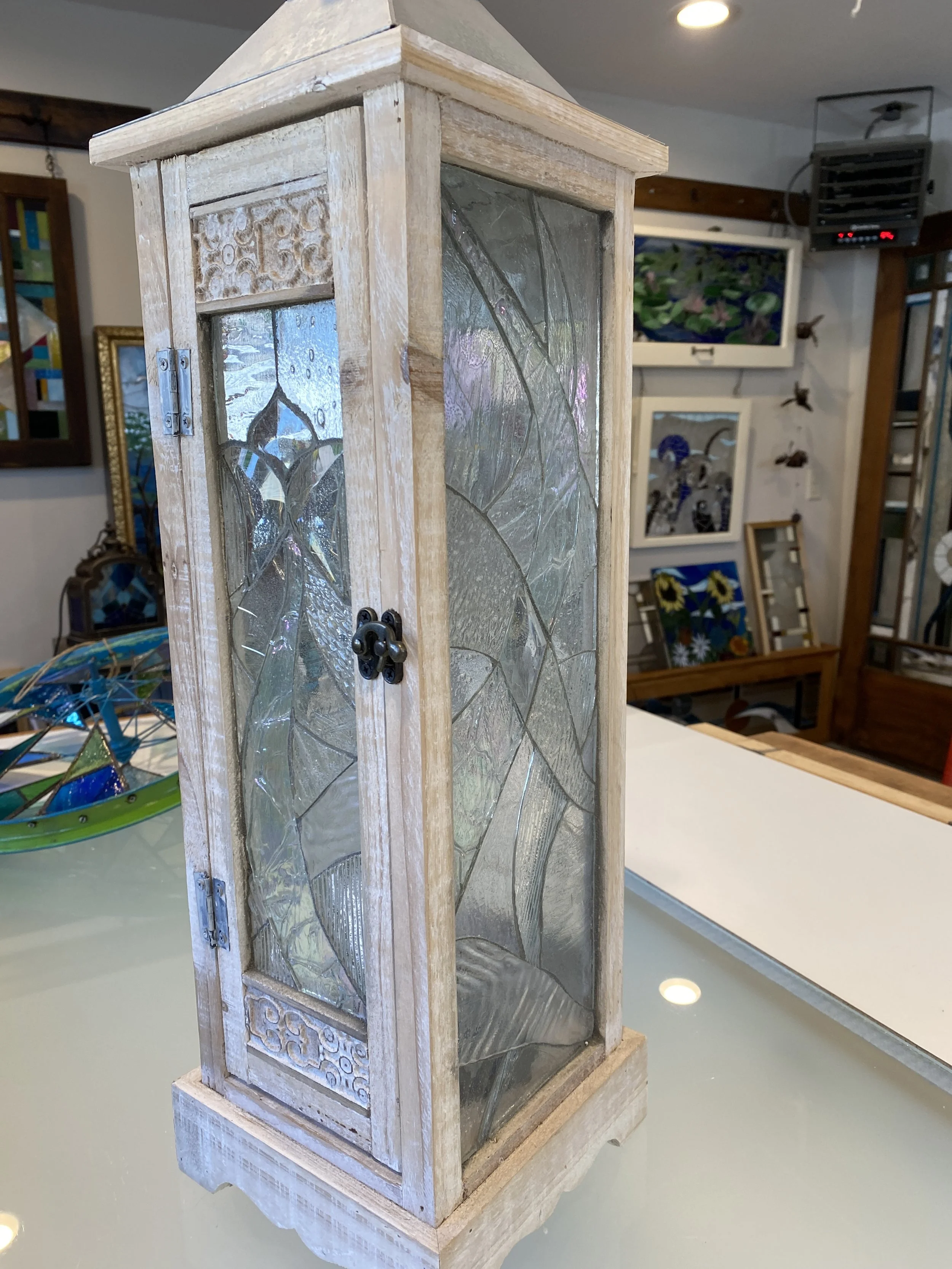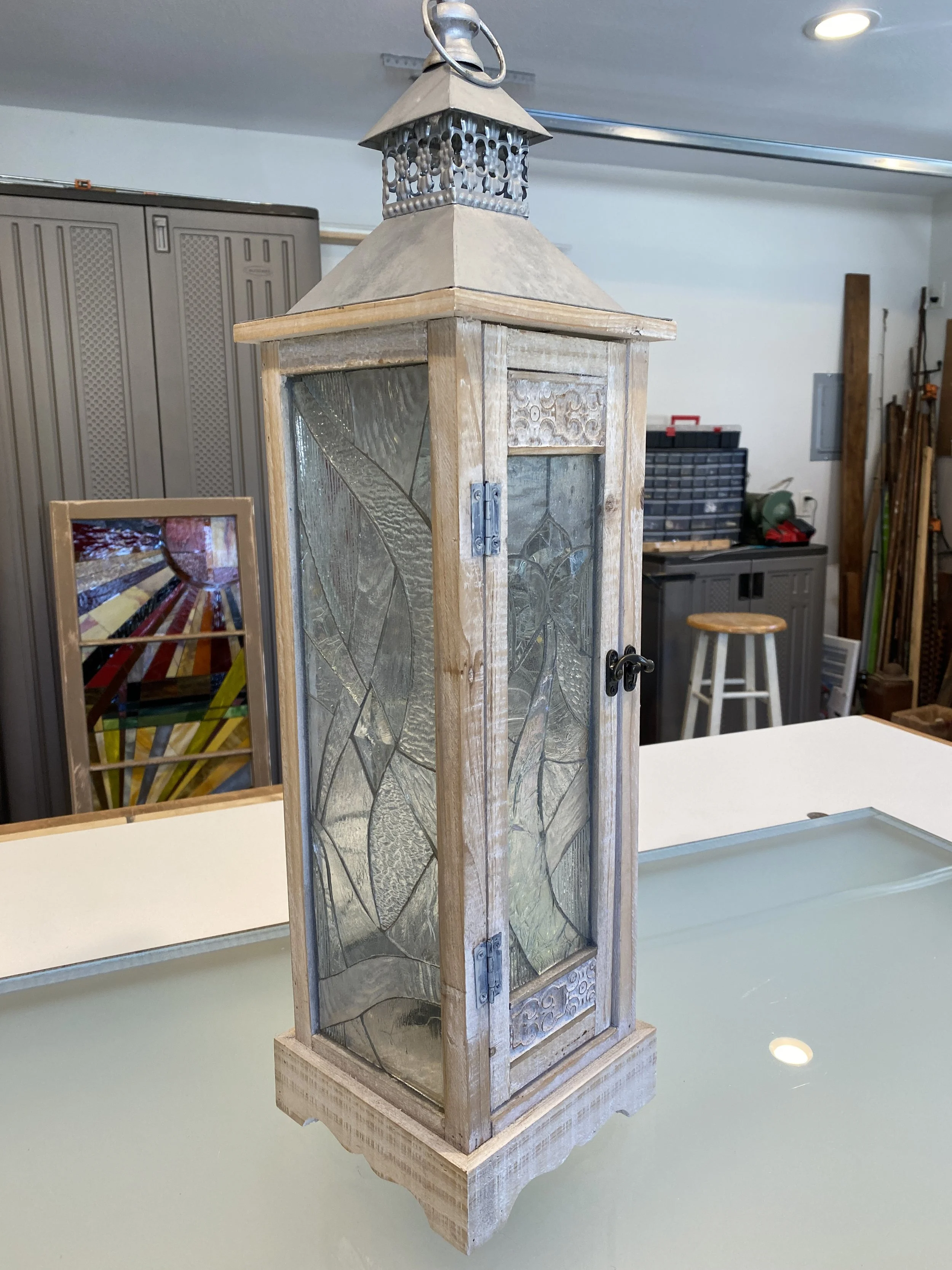 26” x 7 x 7; Stained glass, glass bevels, adhesive and grout on a glass paned wooden lantern