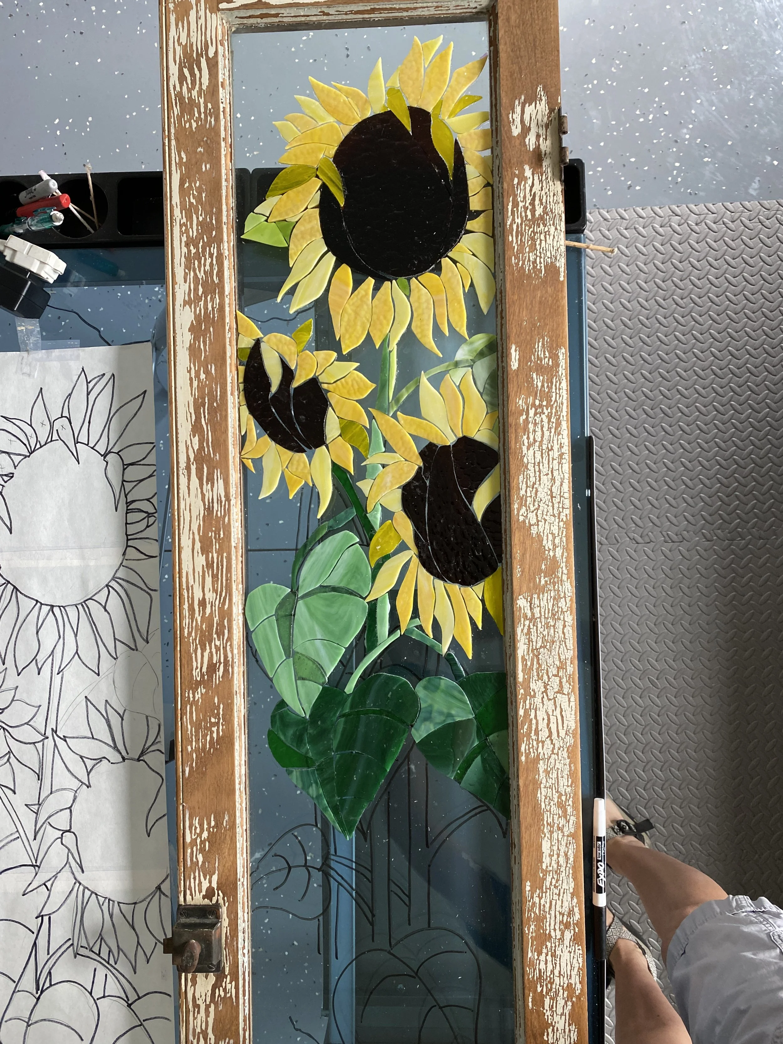 13.5” x 58.5”; Stained glass, adhesive and grout on a paned antique pantry door