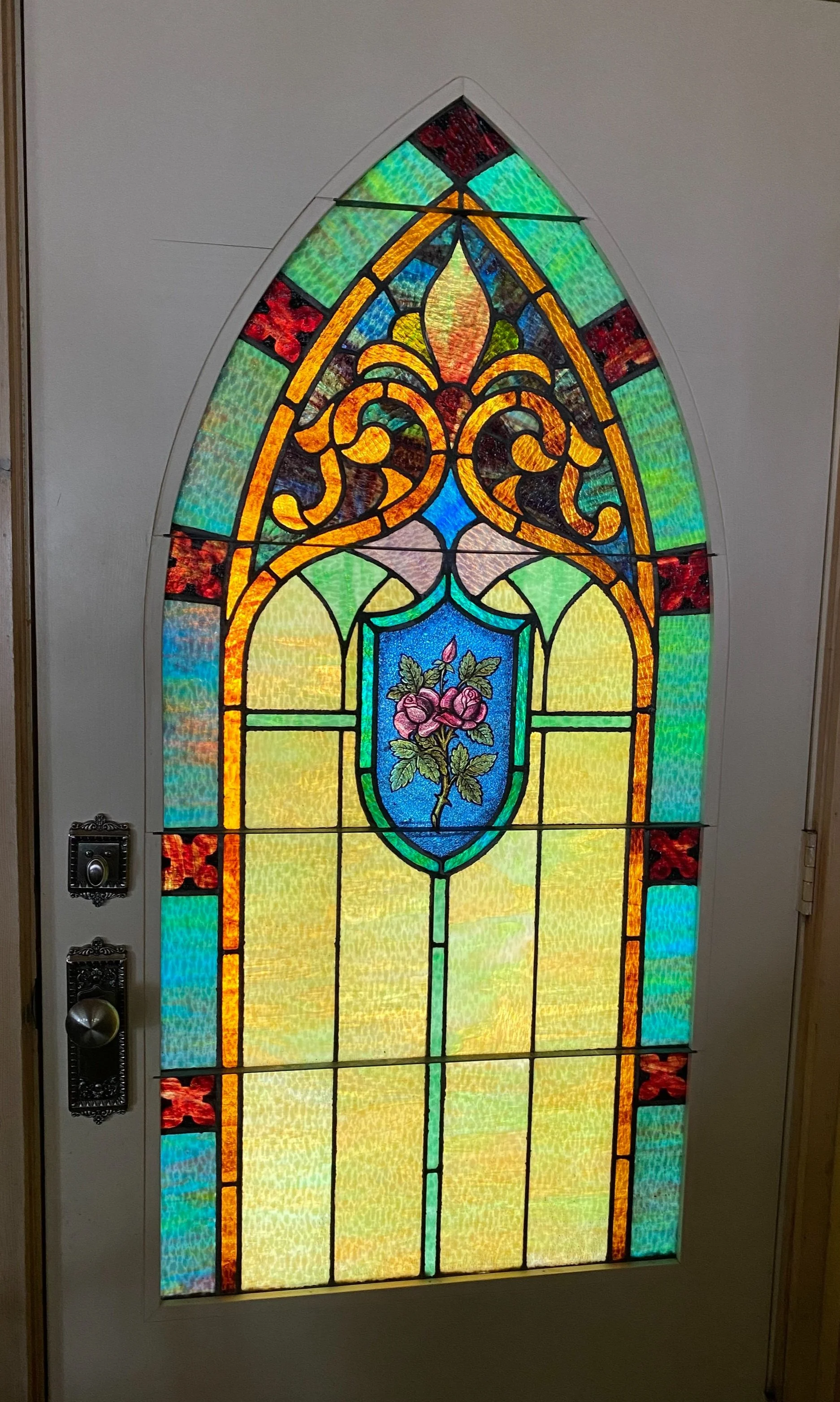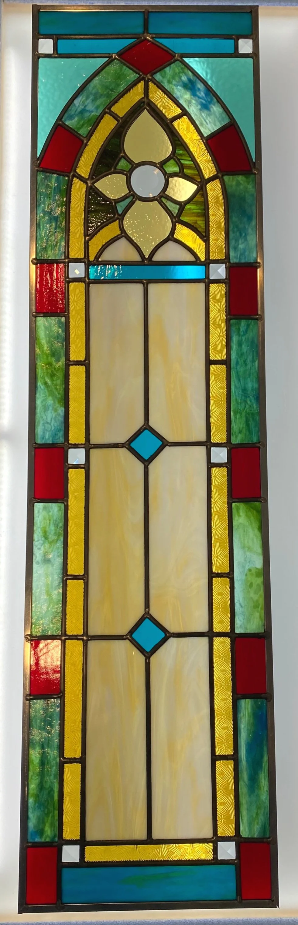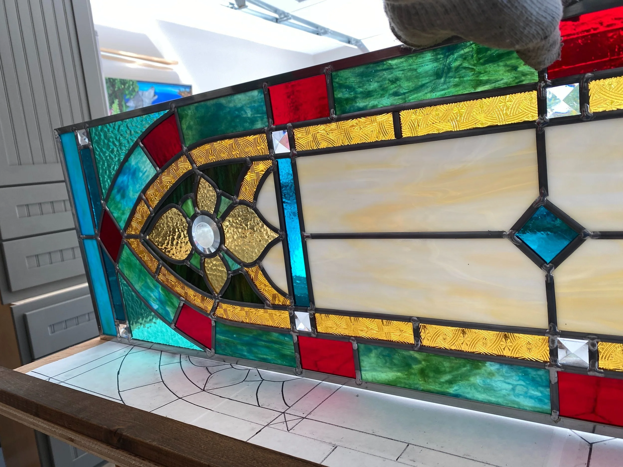 A neighbor approached me and asked if I would be interested in creating a leaded window as a surprise for his wife. I was invited to have a look at two beautiful old church windows they had repurposed into doors for inspiration. Using the colors and design of these doors, I created a template that I hoped would complement their existing pieces. For me, a couple of the challenges of working with lead are cutting the angles so they fit snug and keeping the piece square. It was especially important that this piece fit the desired 48’ x 12.5” as it was to fit into an existing cabinet door. With the glass on glass method I favor, I don’t have to worry about the squareness or maintaining the measurements because the structure already exists. The challenge was on - but I’m very pleased to say that it was a successful venture!