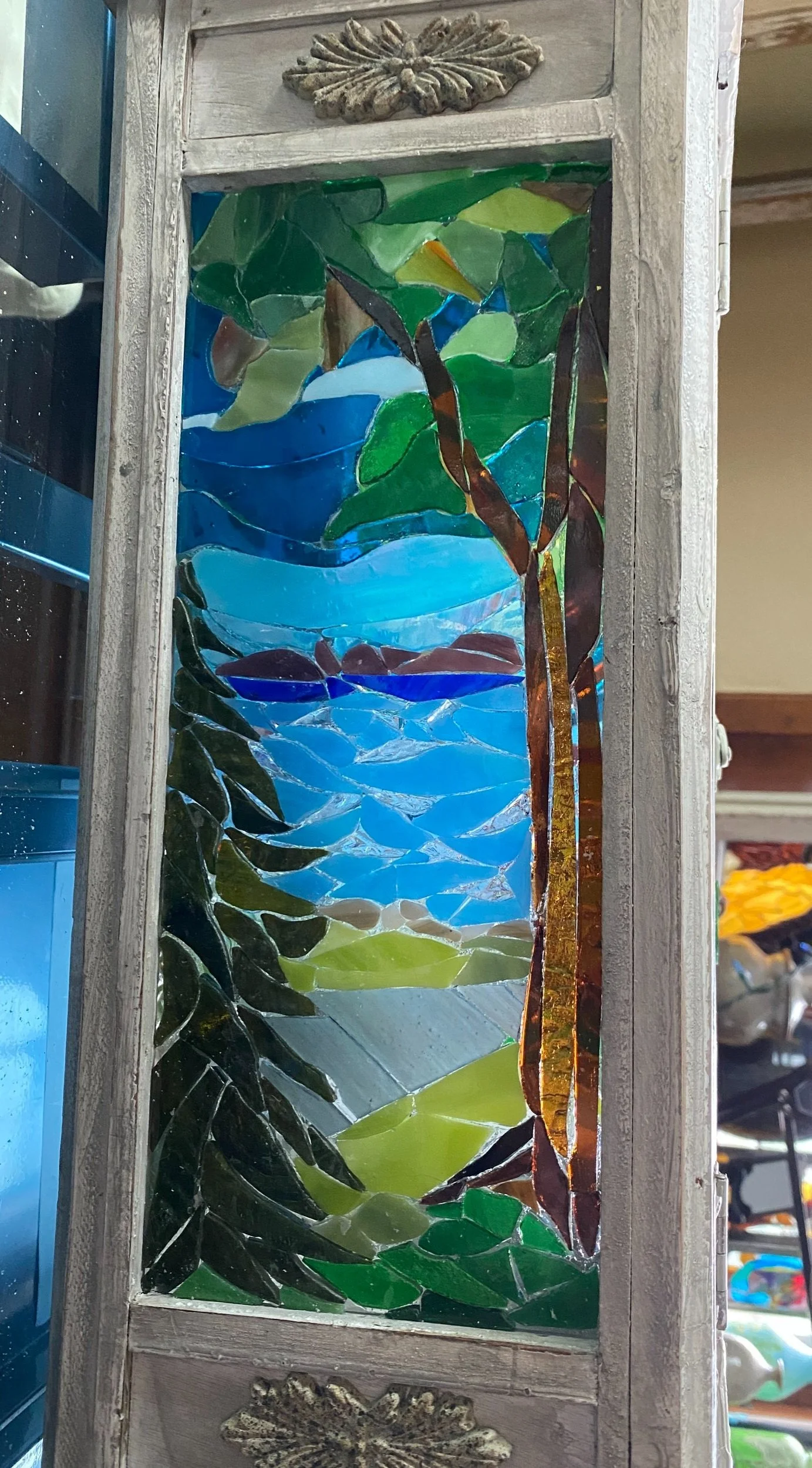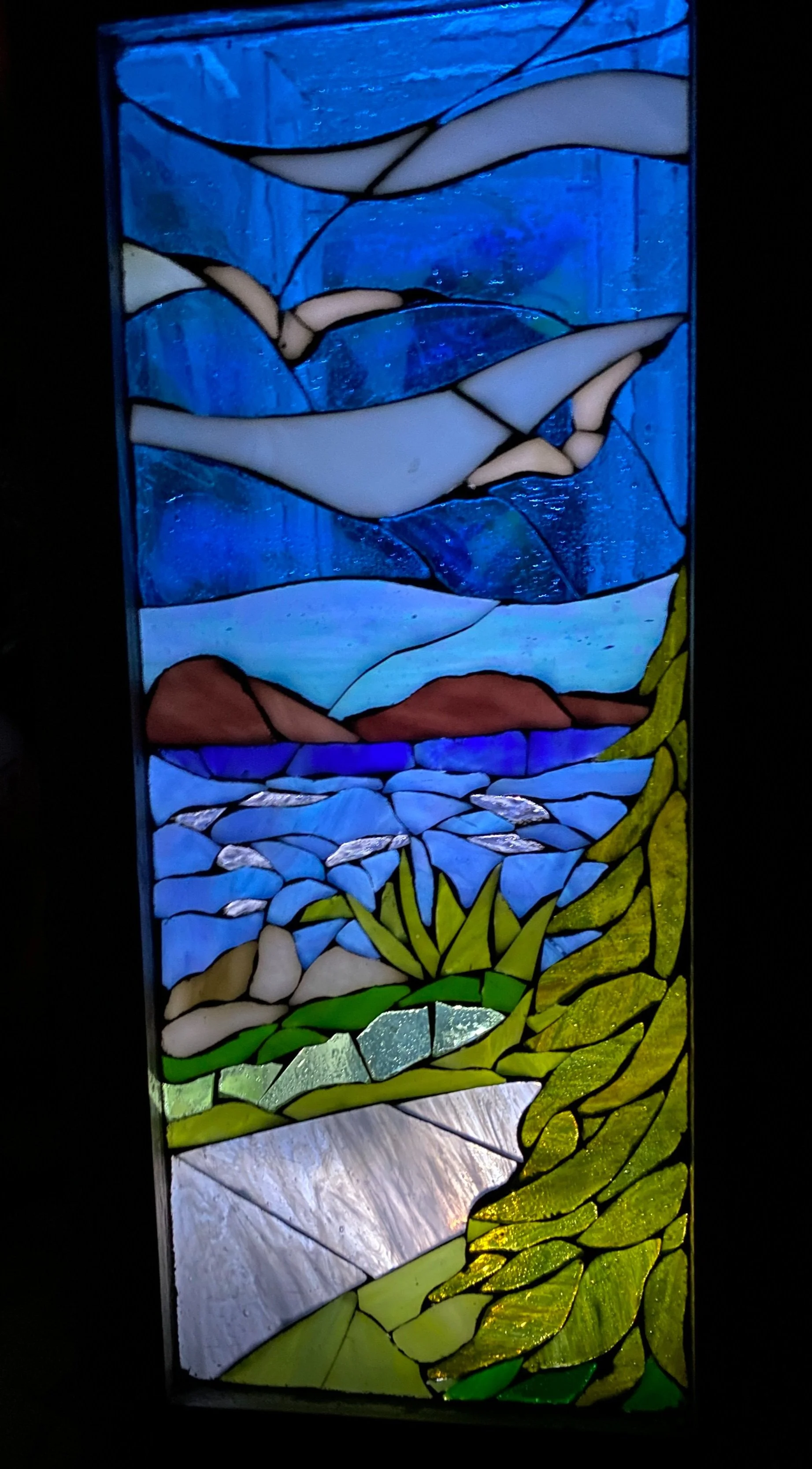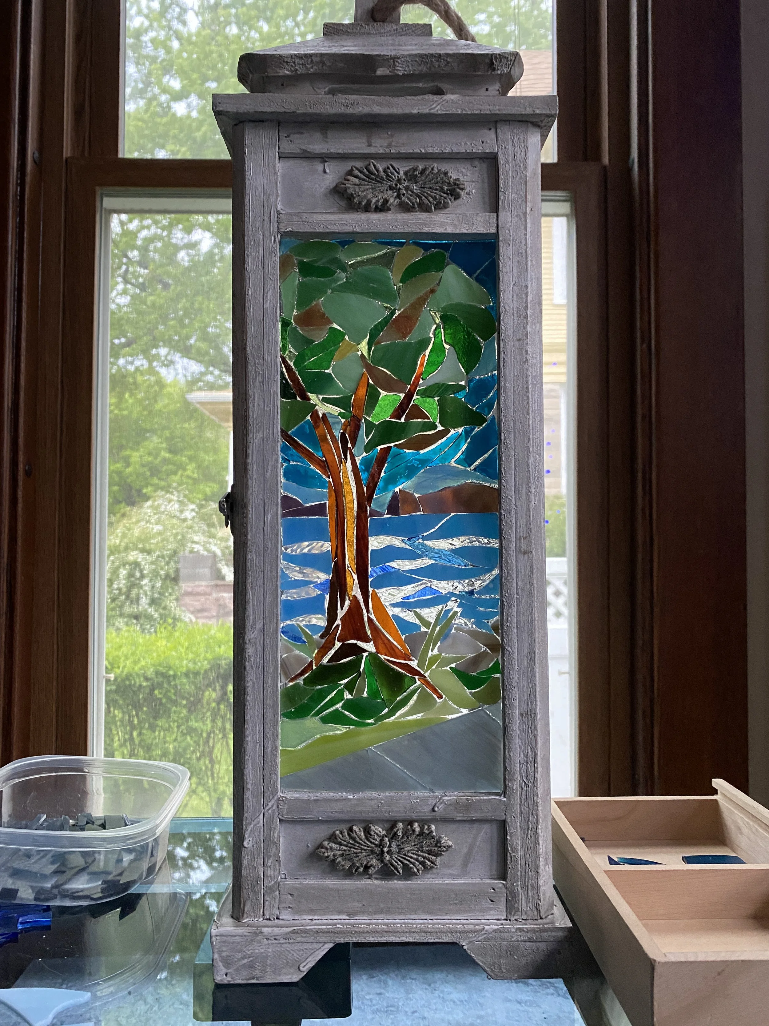 22.5” x 7” x 7”; Stained glass, adhesive and grout on a glass paned wooden lantern, with light