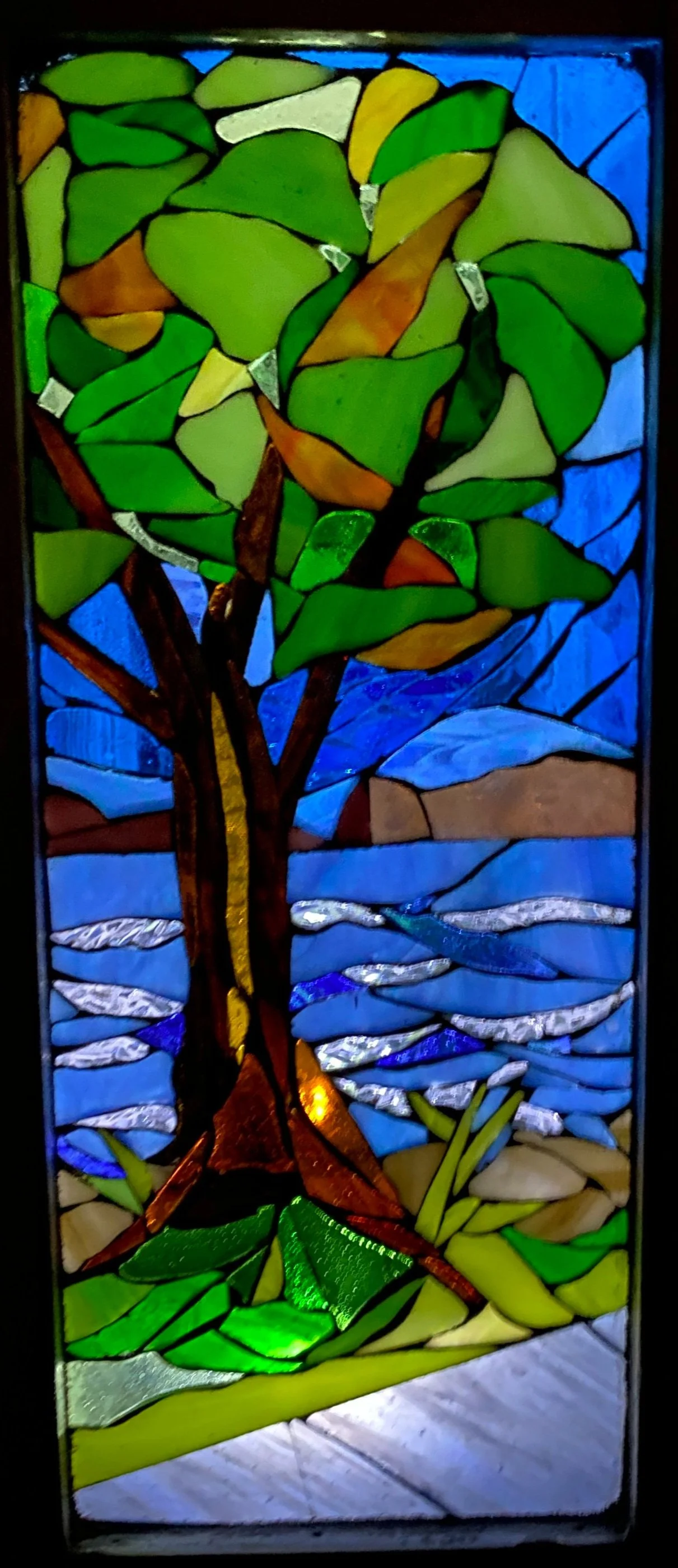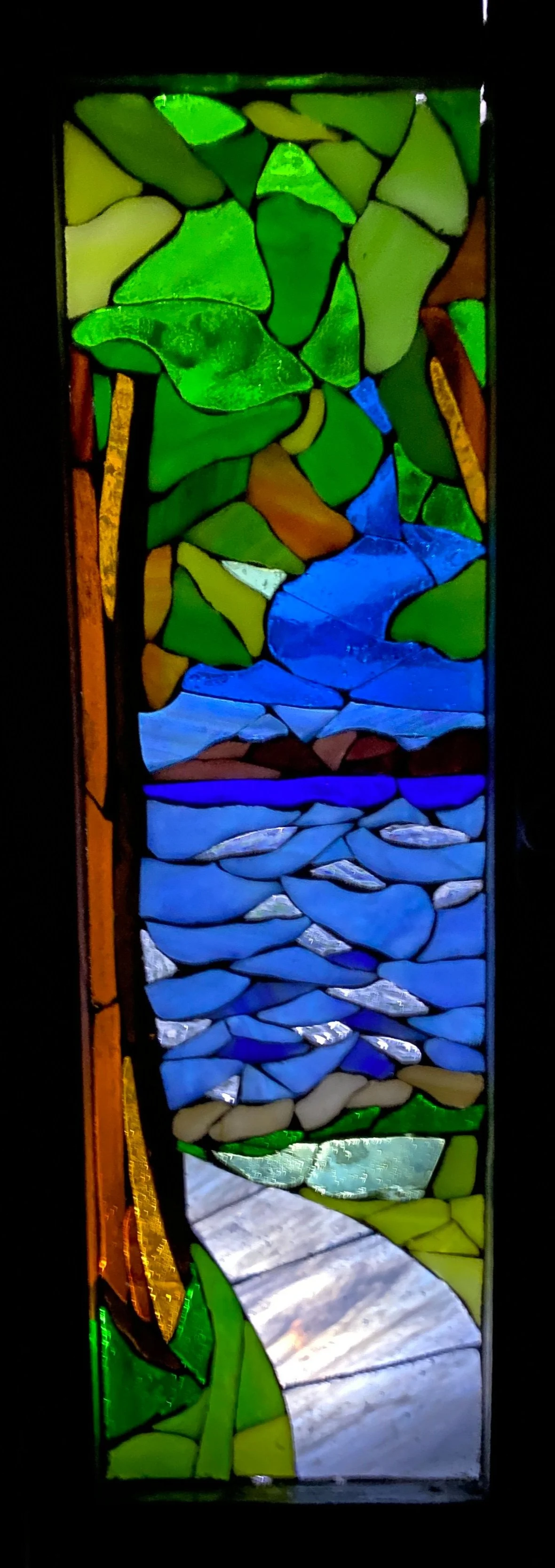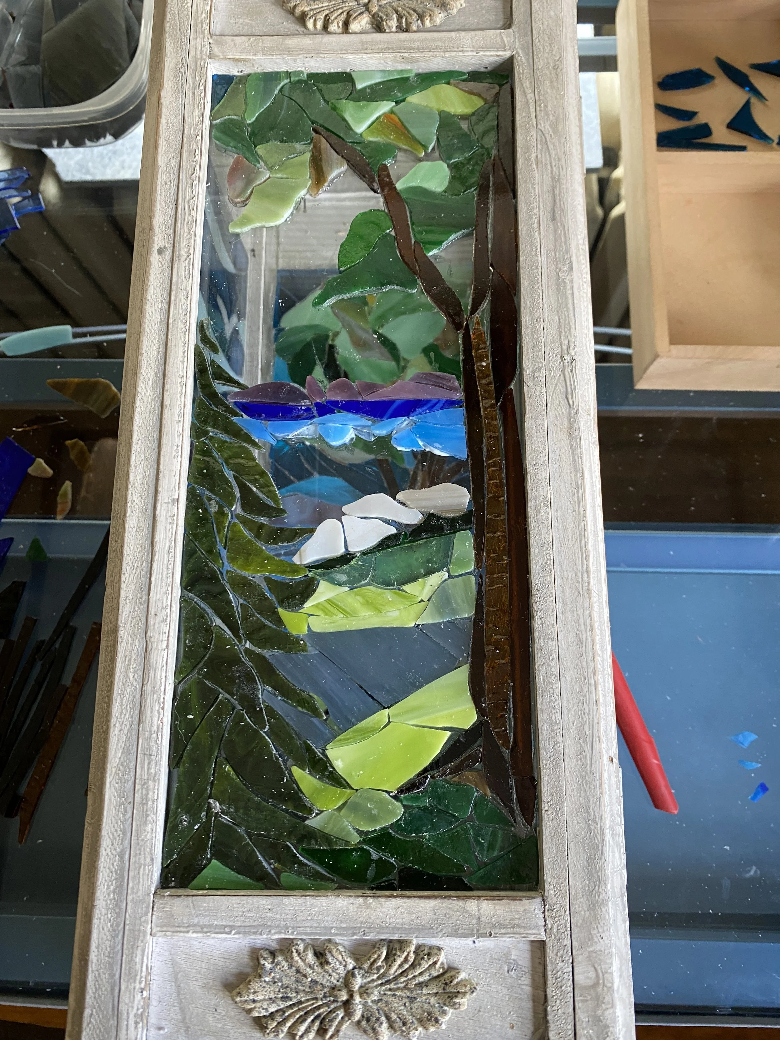 22.5” x 7” x 7”; Stained glass, adhesive and grout on a glass paned wooden lantern, with light