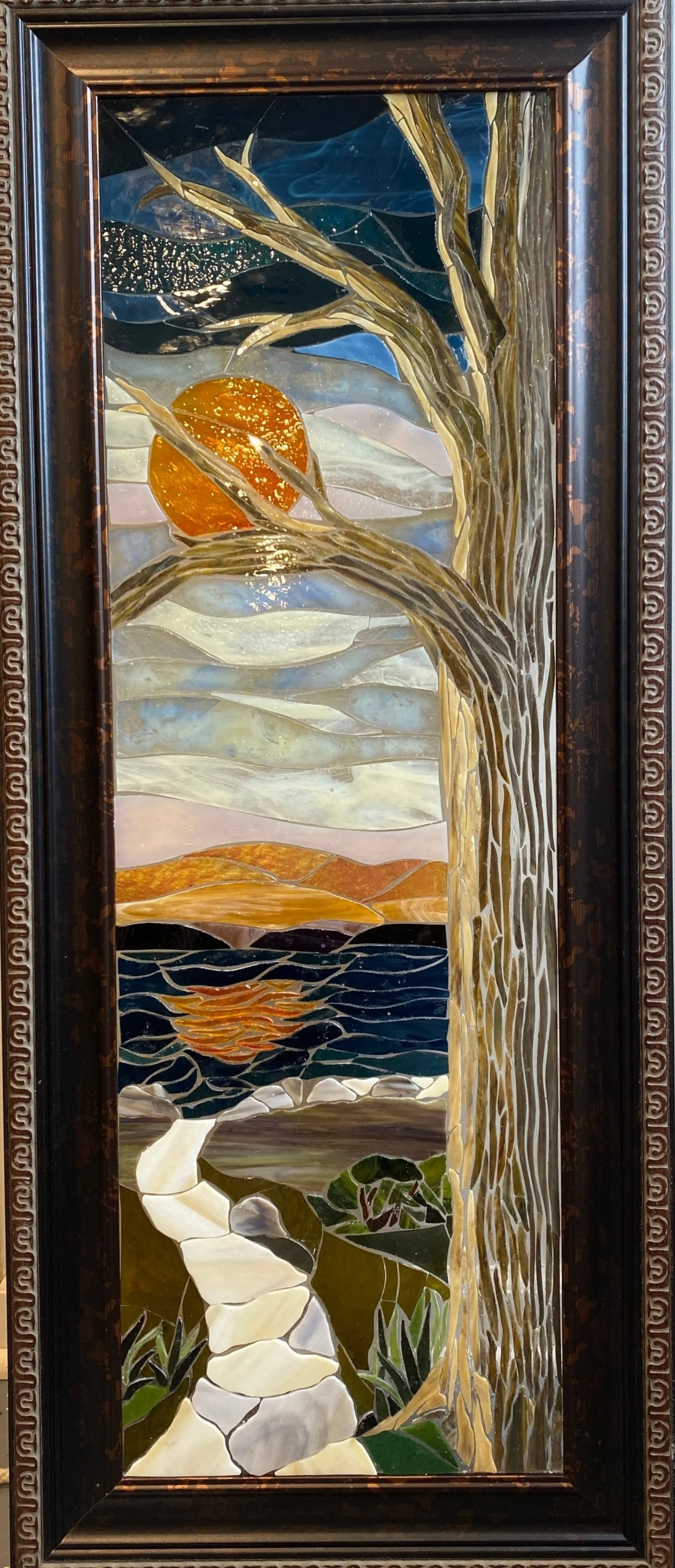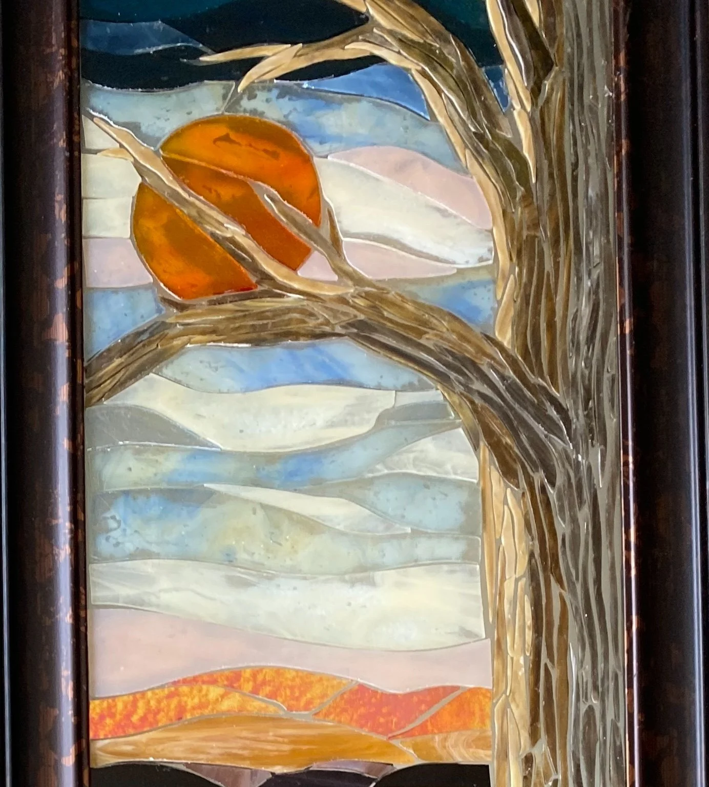 As you can probably tell by now, I enjoy trying to capture the beauty I see in trees - especially the large cottonwoods that grow by the lake. Even though the subject matter is the same, it is fun to play with different colored glass to create an entirely new scene much like the differences I notice on my daily walks. It could be the time of day, seasonal changes, or the daily weather conditions, but every day provides a different look to the same scenery.