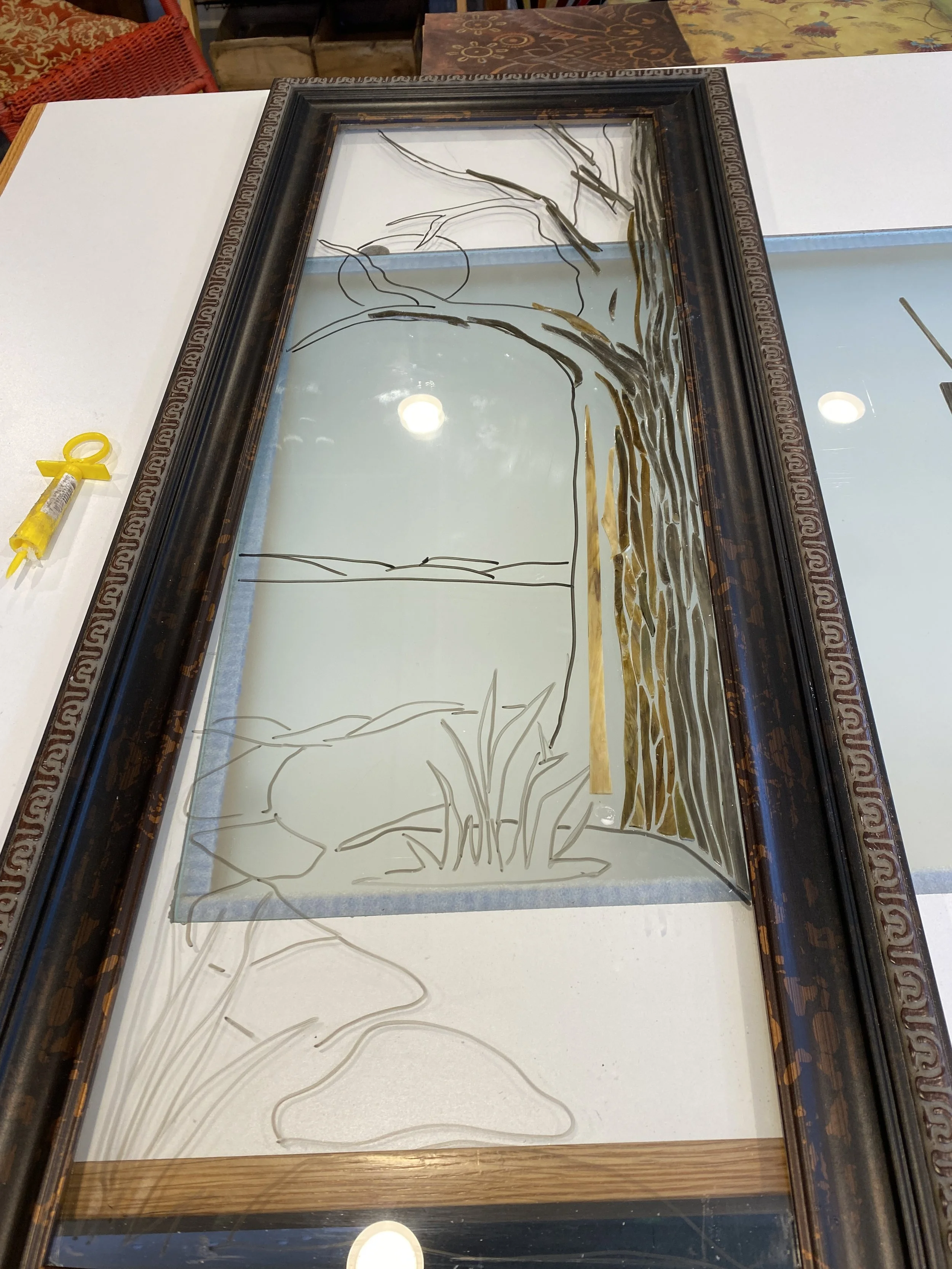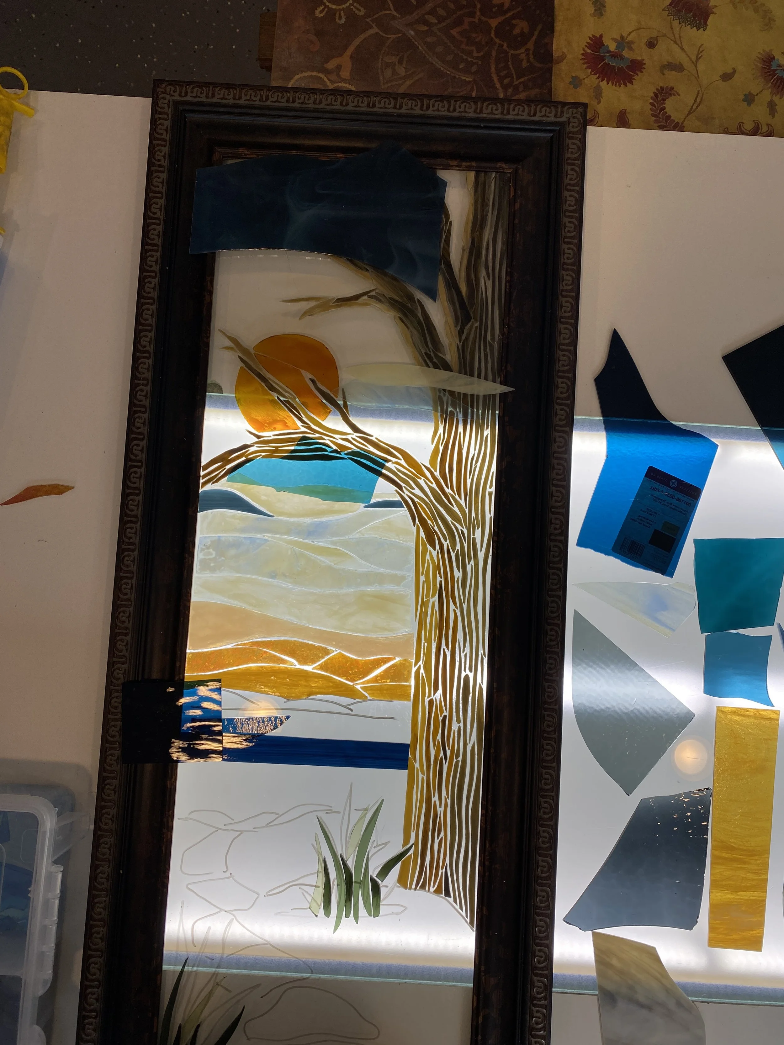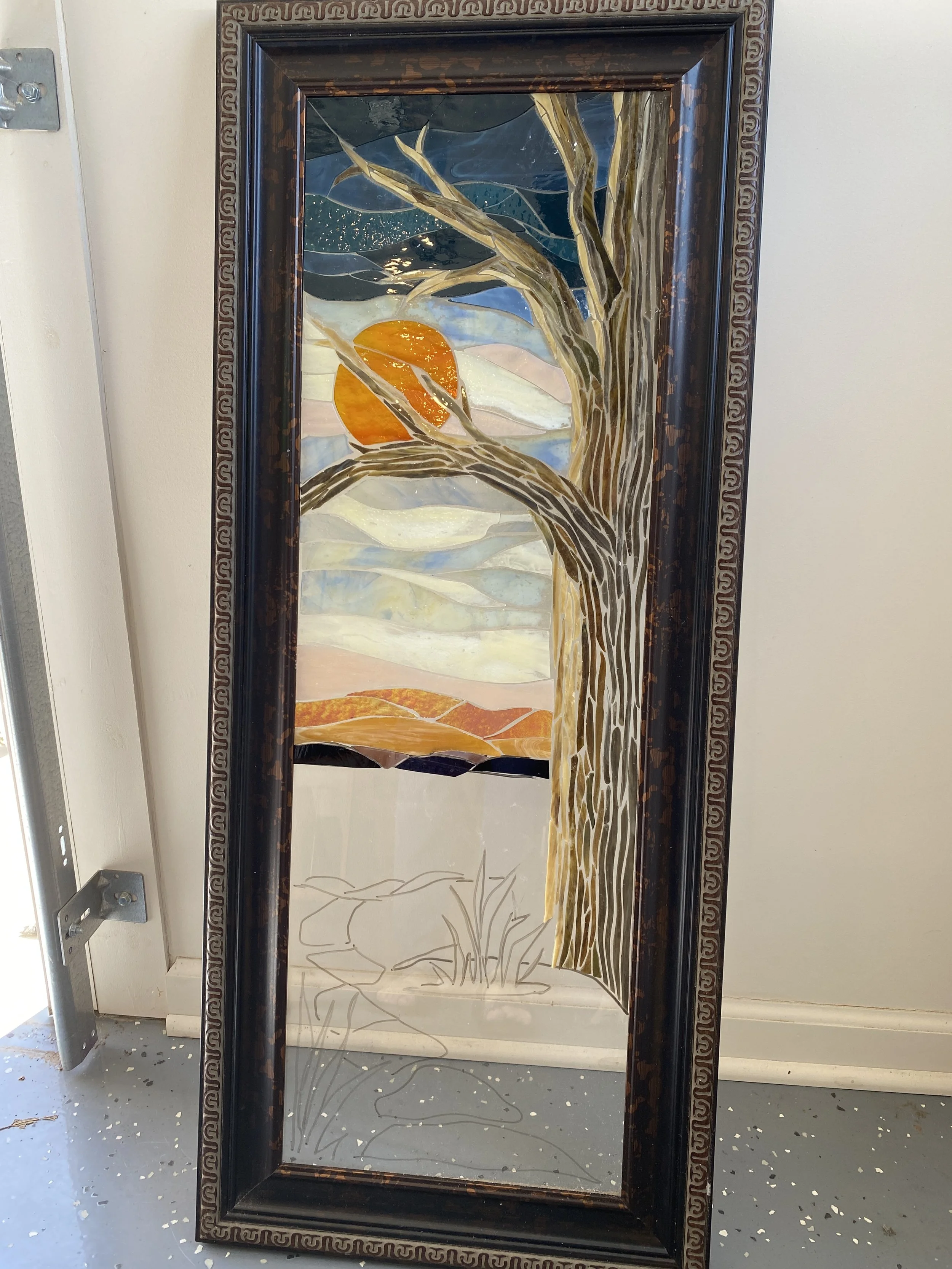 17.5” x 52”; Stained Glass, adhesive and grout on a framed window pane.