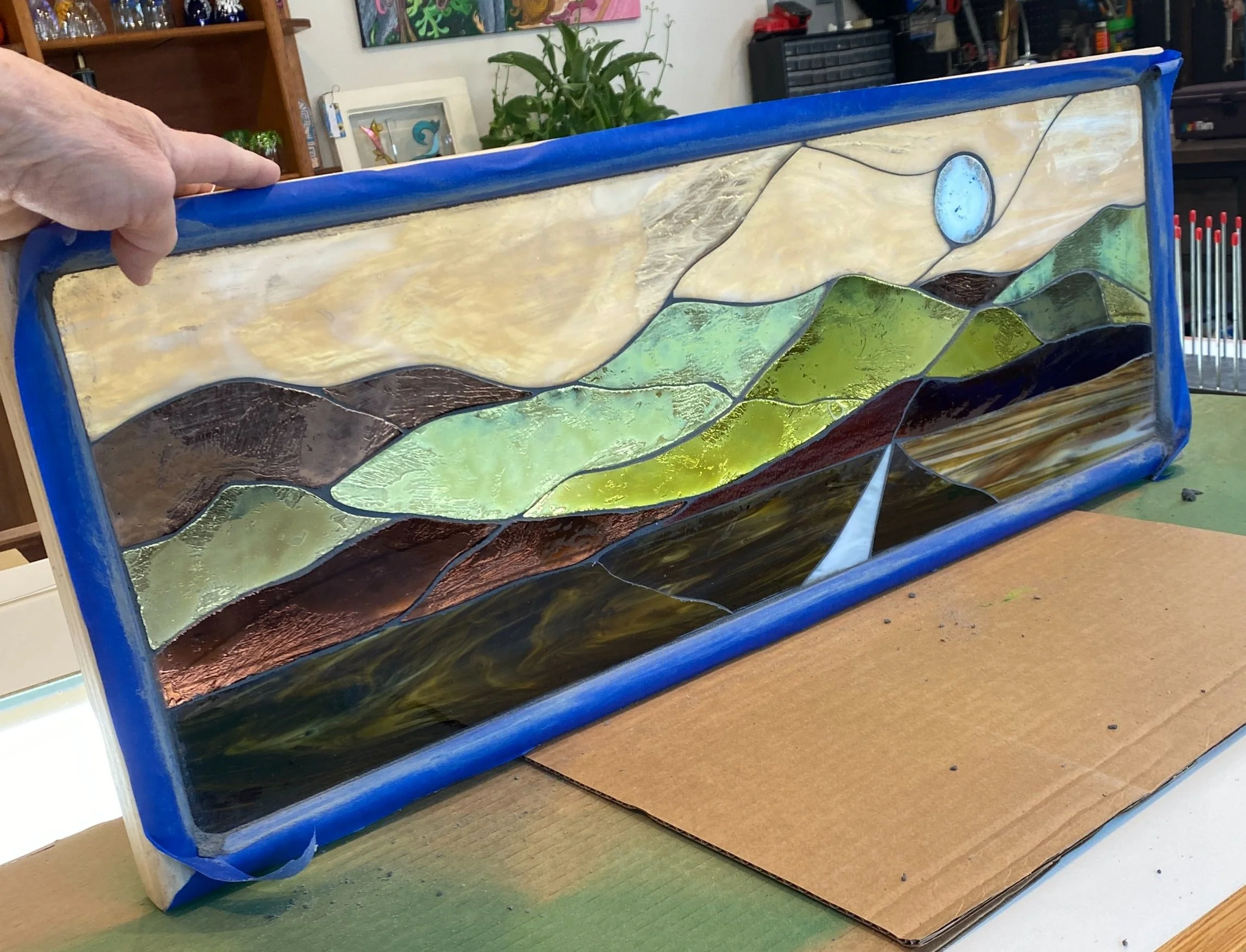 I can easily get caught up in the small details of my creations, which makes my work unique, but also increases time and cost. This simple, rectangular frame I found thrifting seemed to beg for a subtle, uncomplicated piece. I decided to try my hand at creating a mountainscape using larger pieces of glass that allowed the colors and texture of glass to provide depth and dimension without the small details.