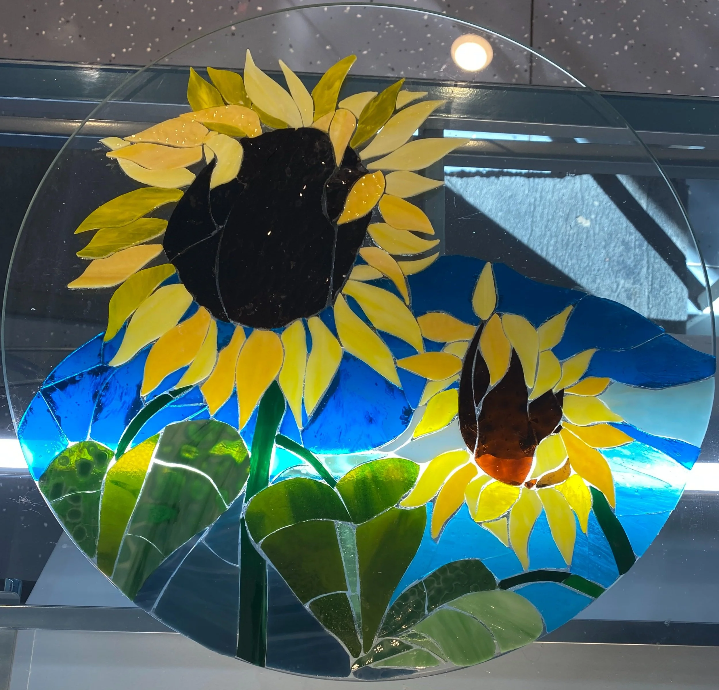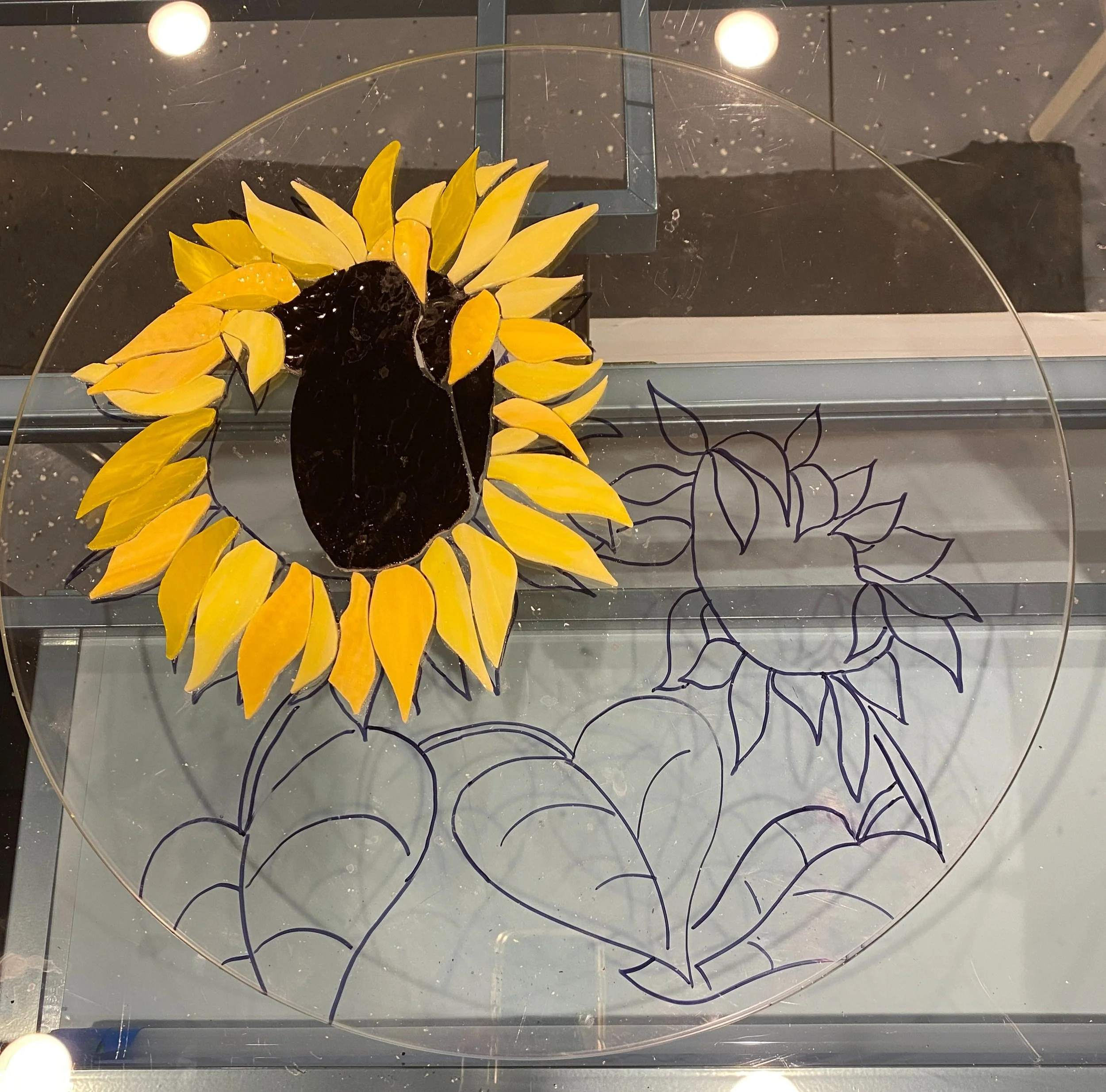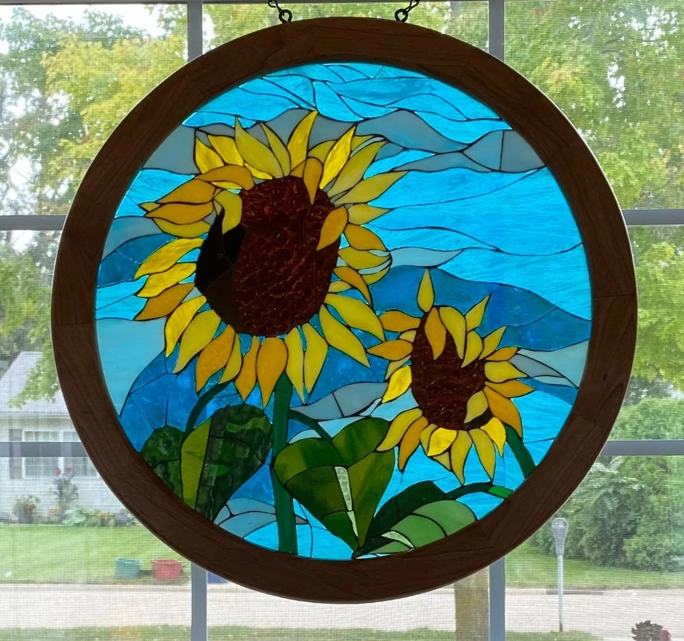 As a boy growing up in Kansas, my husband has a keen appreciation for sunflowers. Each summer we plant sunflowers of all varieties and especially enjoy those that grow over 10 feet tall! I enjoy capturing their bright color and easily identifiable characteristics in glass.