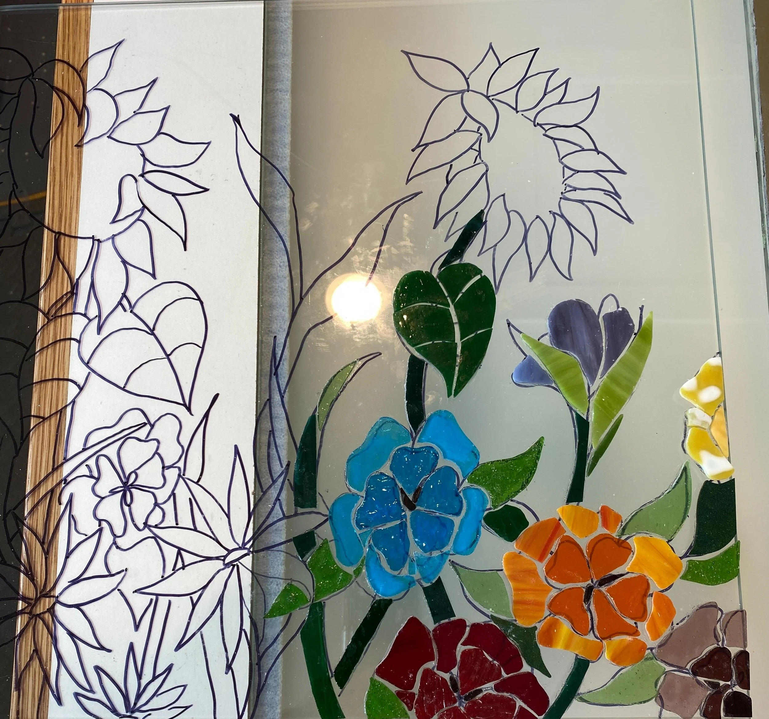 16” x 16”; Stained Glass, adhesive and grout on a plate of tempered glass;